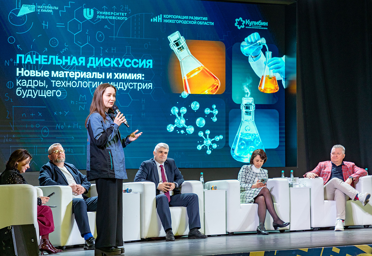 В панельной дискуссии «Новые материалы и химия: кадры, технологии, индустрия будущего» приняли участие заместитель председателя правительства Нижегородской области Екатерина Солнцева, генеральный директор Корпорации развития Нижегородской области Игорь Ищенко, ректор ННГУ им. Н. И. Лобачевского Олег Трофимов, вице-президент Российского Союза Химиков Дмитрий Огородцев, ведущий инженер-исследователь компании «РусСилика», выпускник химического факультета ННГУ им. Н. И. Лобачевского Софья Бурова.